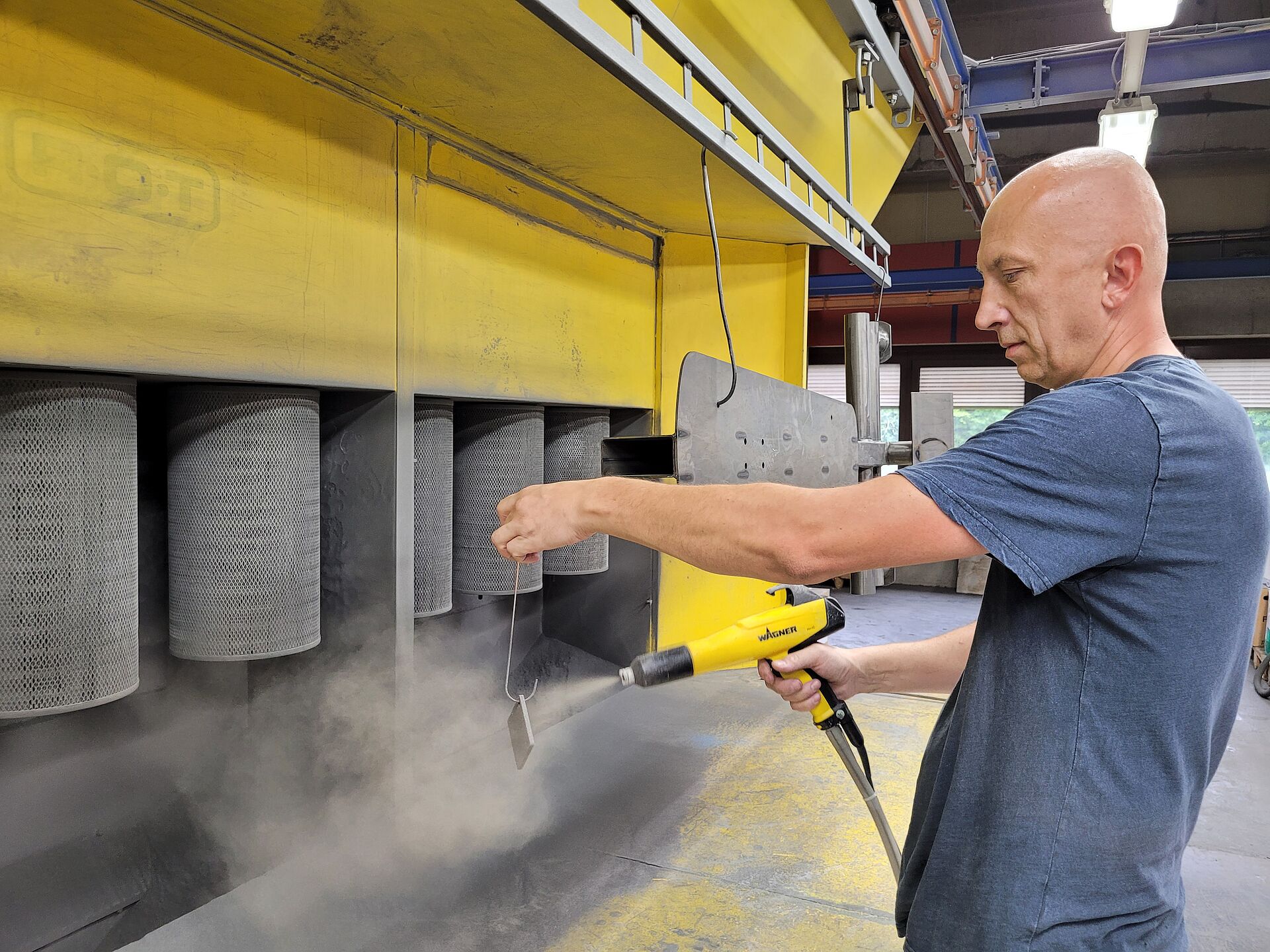 Wenn alle Teile perfekt verschweißt sind, folgt der nächste Produktionsschritt: die Pulverbeschichtung. Auch sie wird sorgfältig kontrolliert, denn die Beschichtung muss eine bestimmte Stärke und Deckkraft haben, muss perfekt haften und darf keine durchscheinenden Stellen aufweisen. „Um die Haftfestigkeit zu kontrollieren, machen wir die sogenannte Gitterschnittprüfung, die wir exakt dokumentieren“, sagt der QM-Manager. „Hierzu wird ein Probeteil gepulvert und dann durch Schnitte mit einem speziellen Gitterschnittmesser so eingeritzt, dass ein Quadratmuster entsteht. Im Vergleich mit Vorlagen der ISO-Norm 2409 können wir dann sehen, ob alles richtig eingestellt ist oder ob wir noch etwas an den Bauteilen oder der Maschine anpassen müssen.“